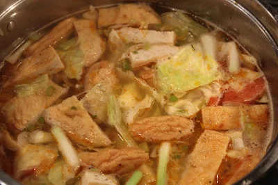 3. Add the cha ca and cabbage to the broth. Let everything cook thoroughly.